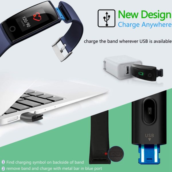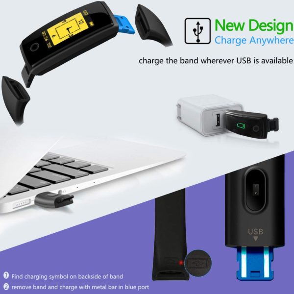 A Yes - just make sure you take the right part of the band off - there is a charging symbol embossed on the back, and when you take that side of the band off, it reveals a blue piece that fits into the usb charger. If you take the wrong side off, there is a dark piece that looks like it might be a charger, but it is not.